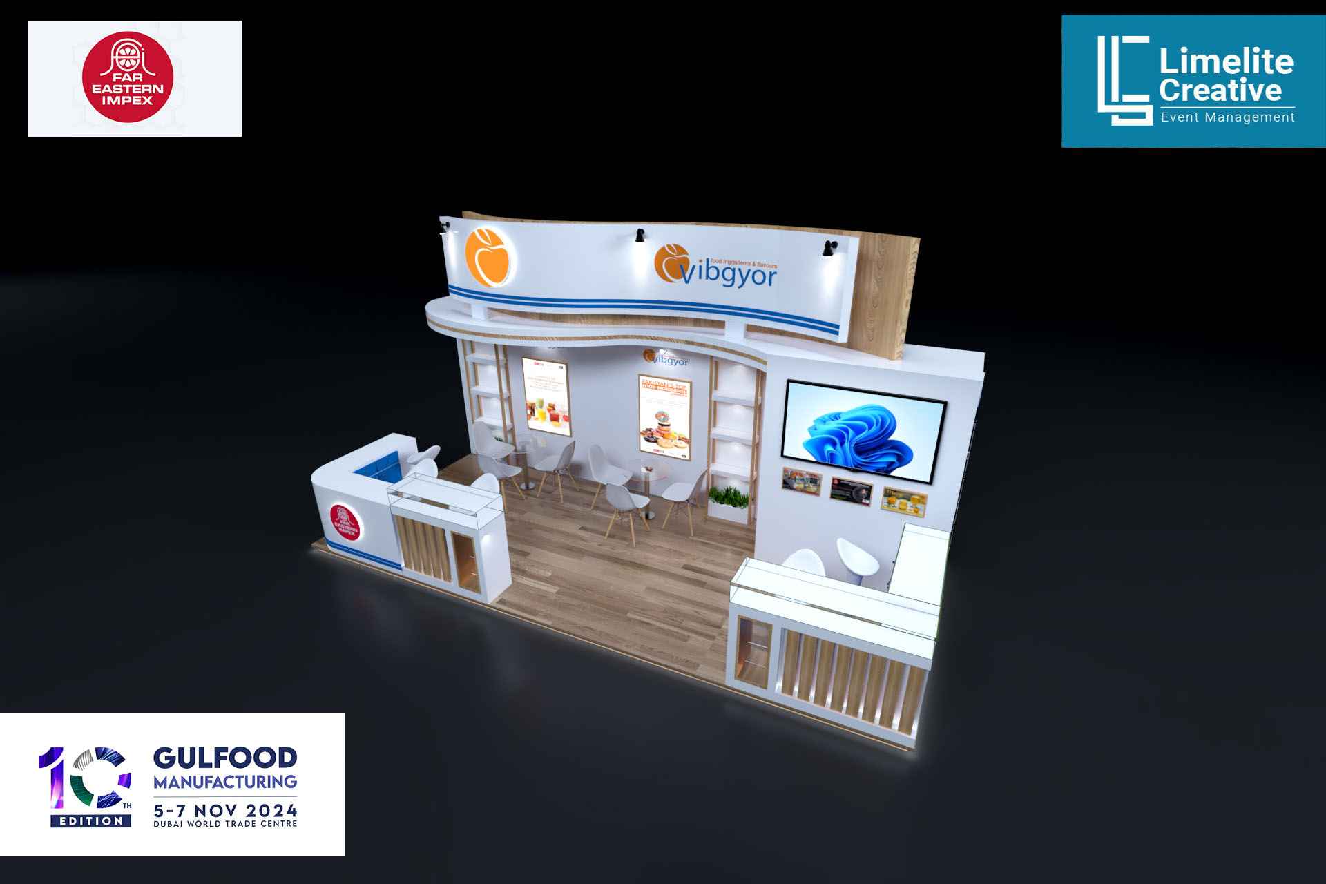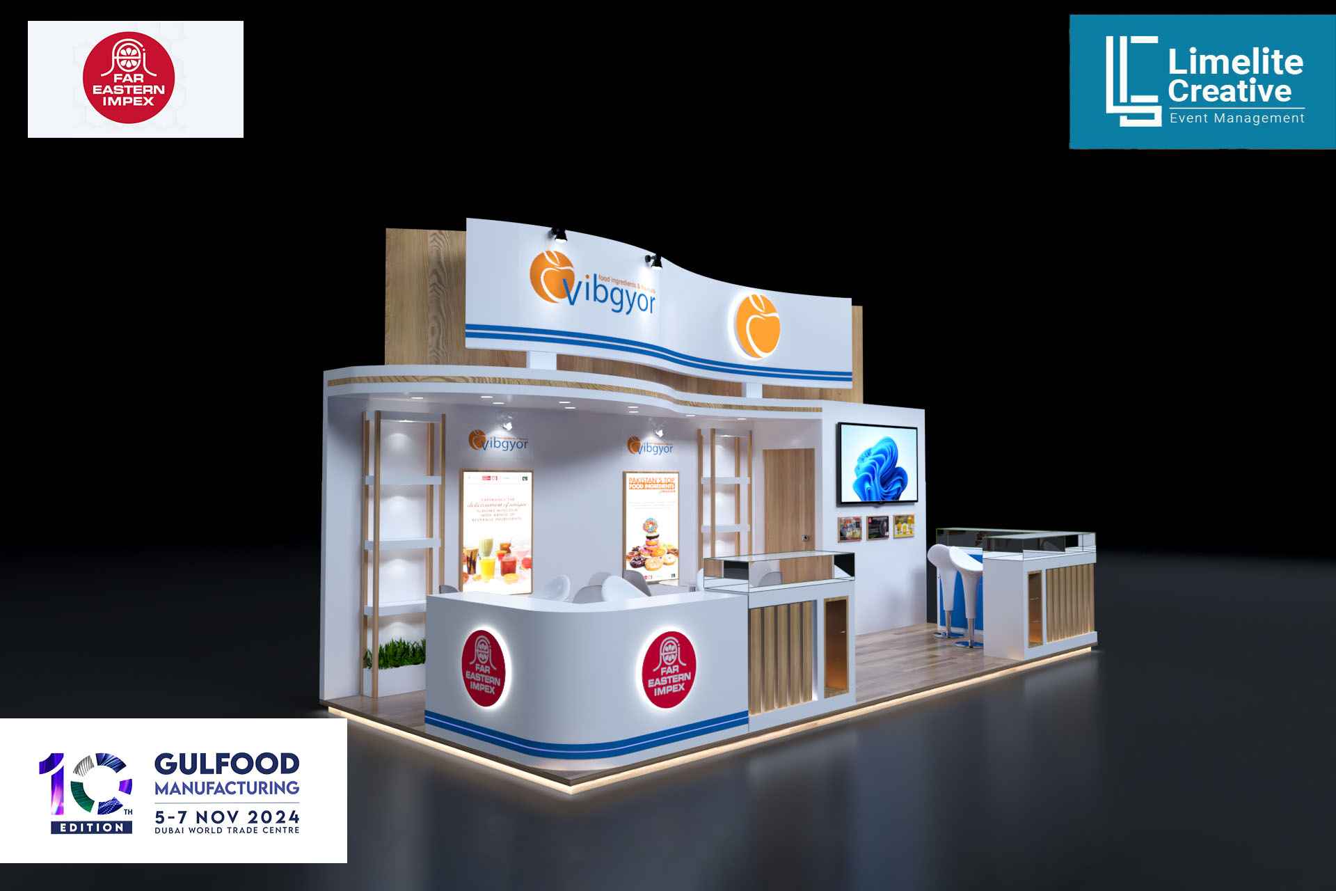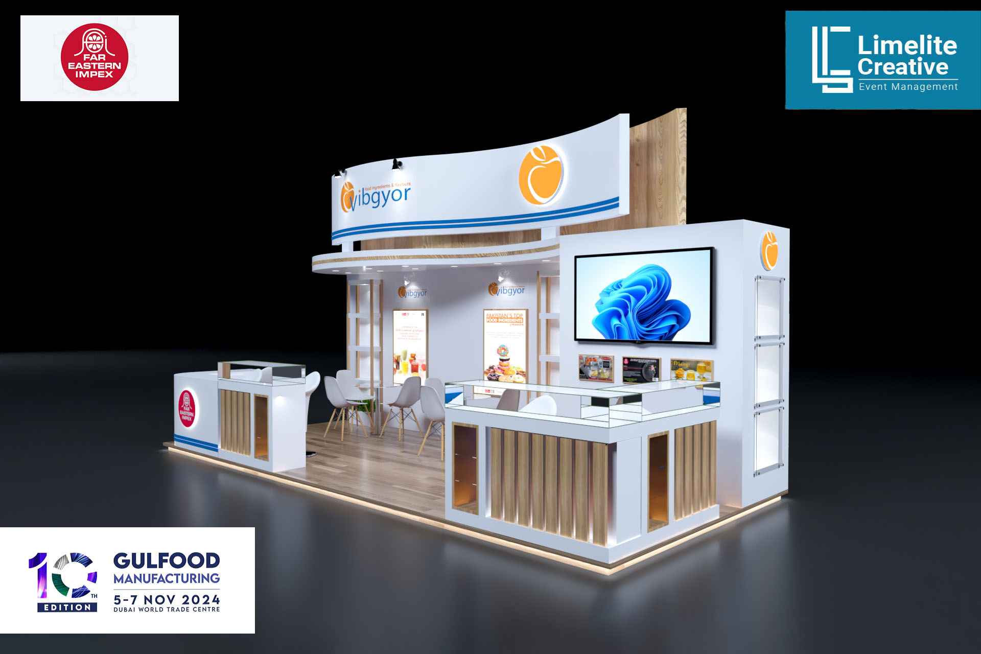 Far Eastern stall size was 7mX3m having total area of 21 squares meter. The design looked simple & beautiful with nicely lighted logos on counter & back wall along with backlit boards.