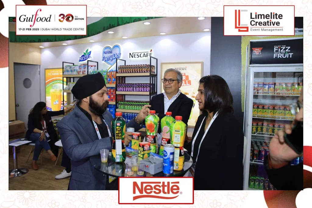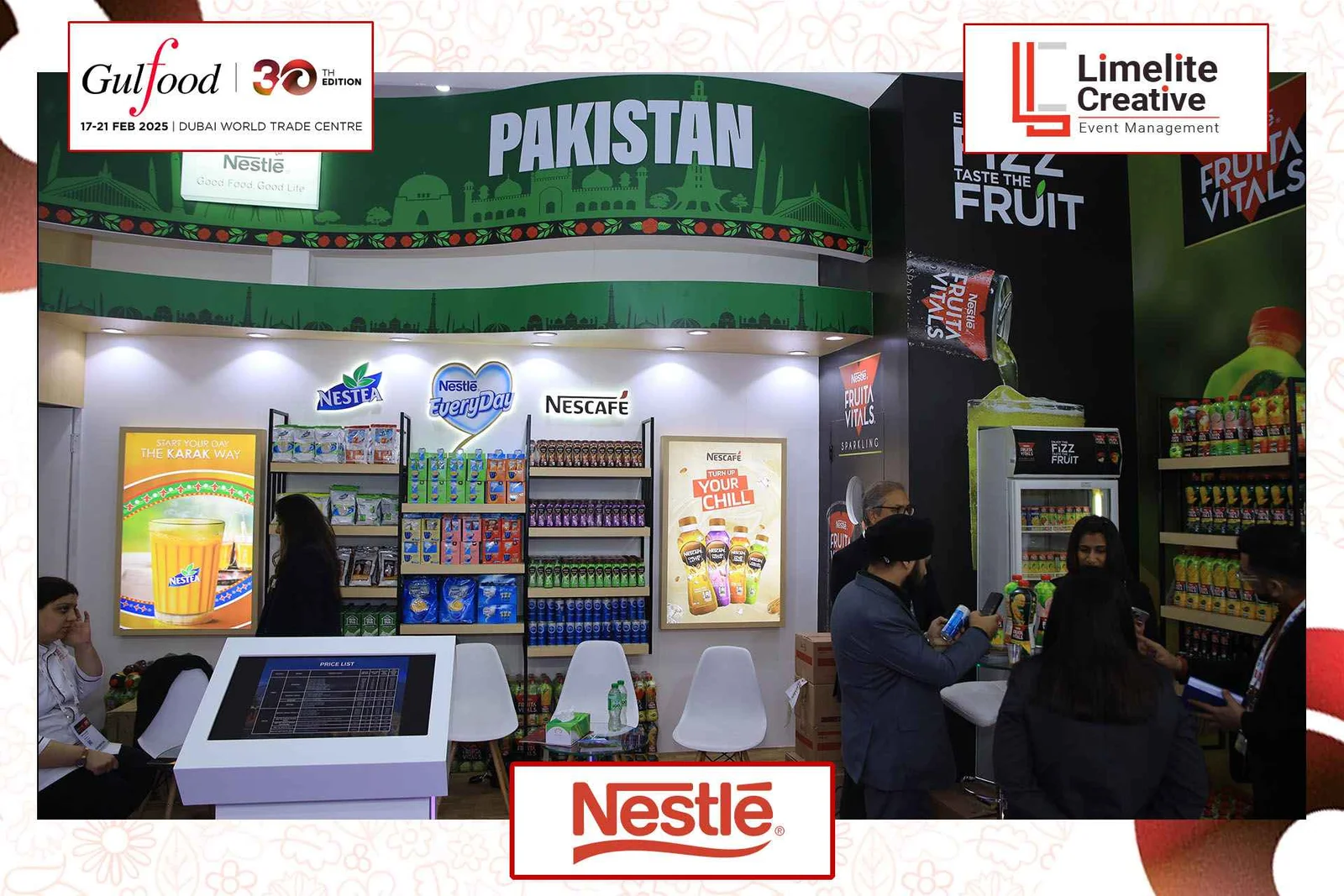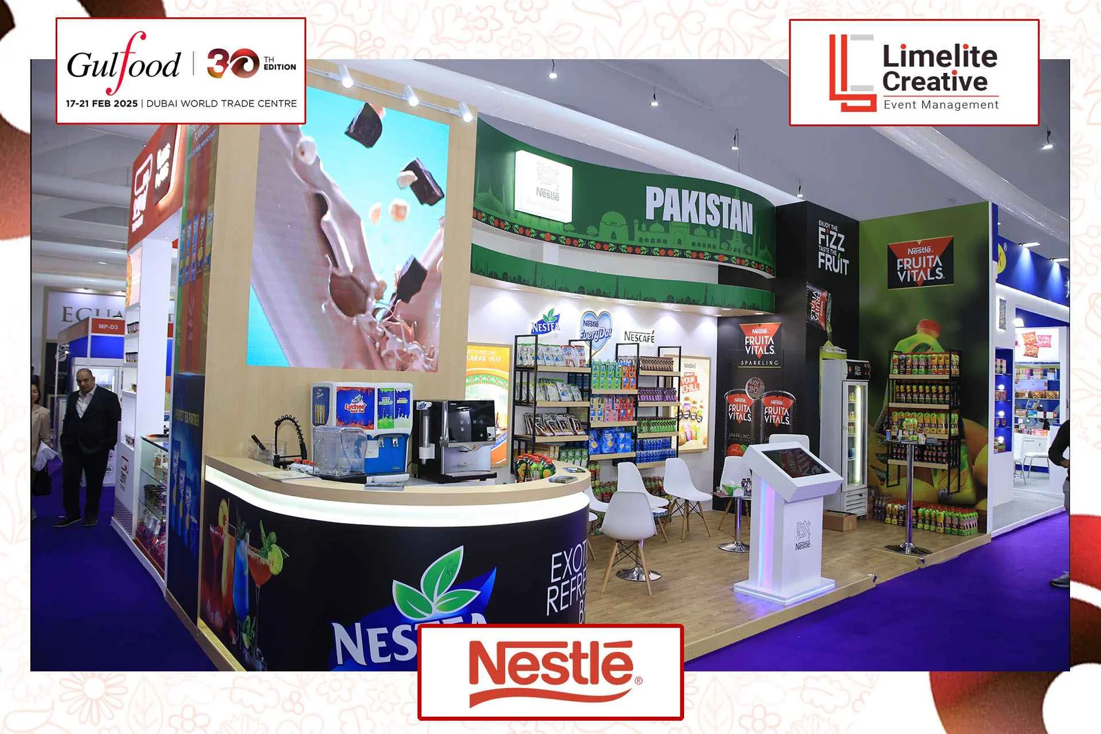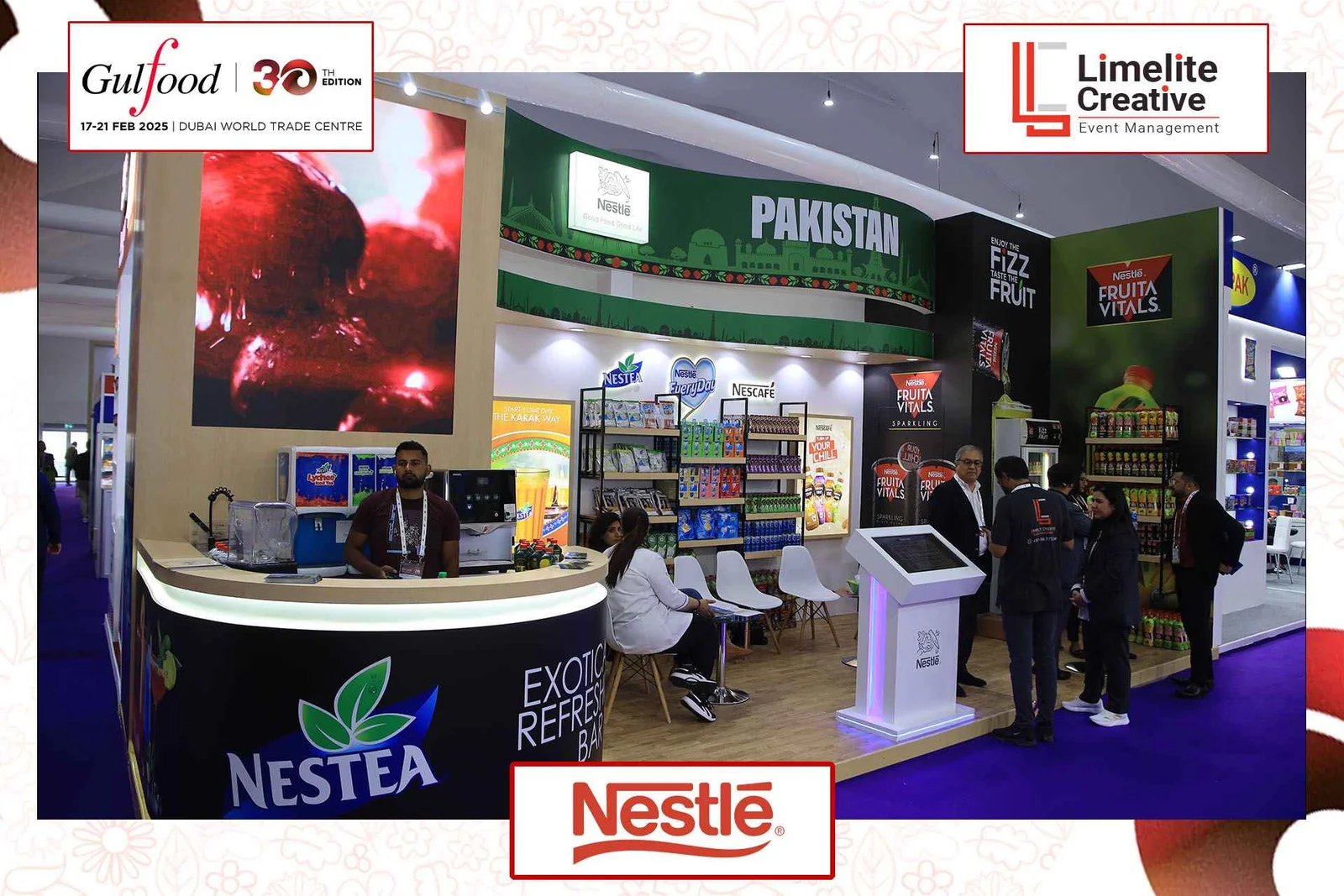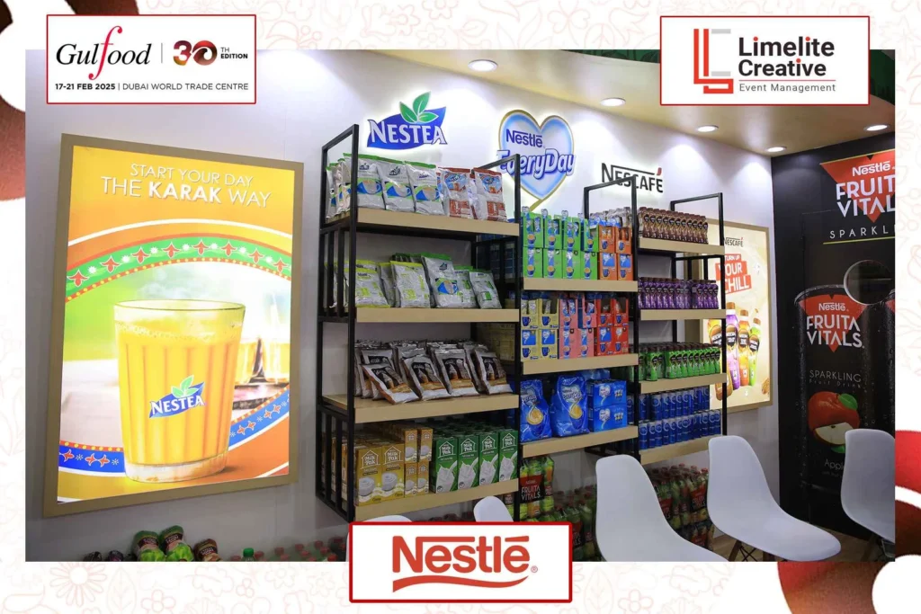 A sleek 8m x 3m booth for Nestlé at Gulfood 2025, featuring bold branding, interactive product displays, and a modern layout to highlight their diverse product portfolio and attract global visitors.