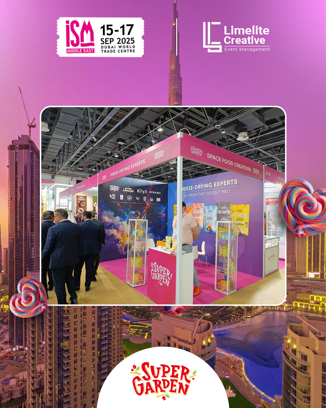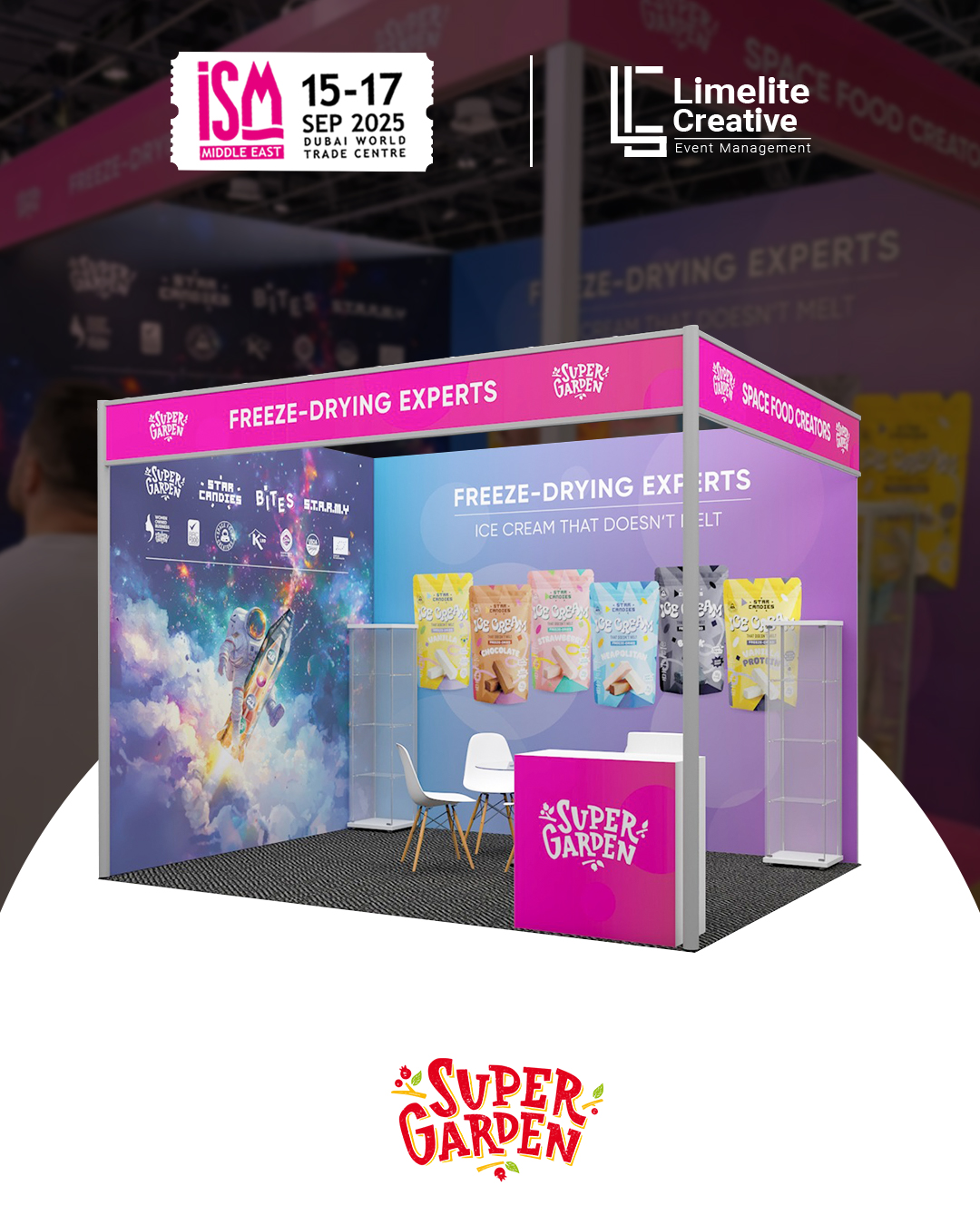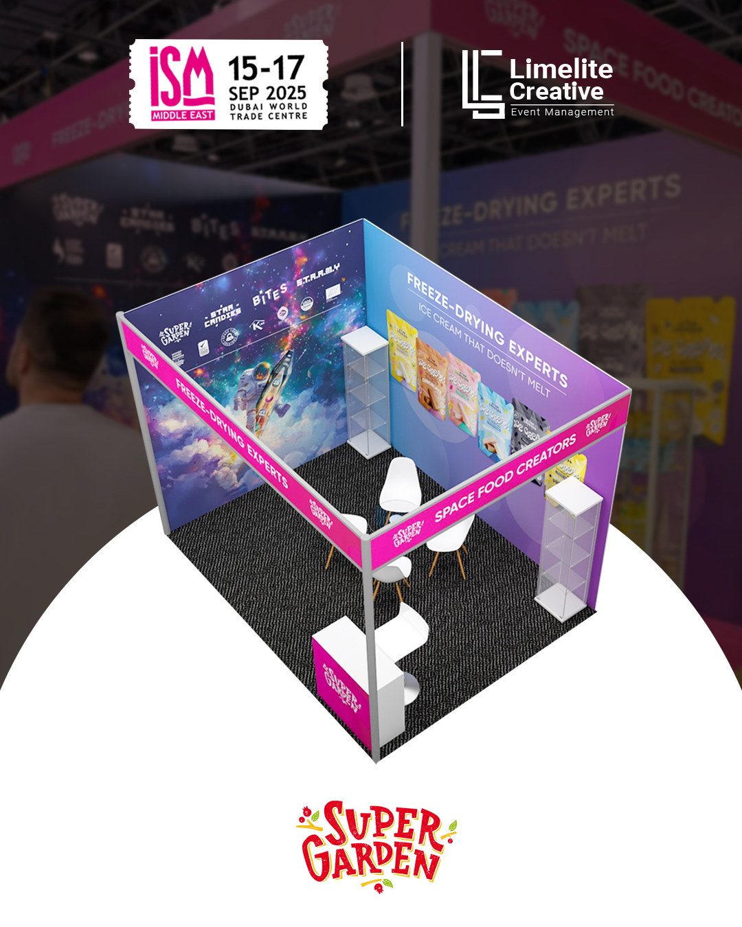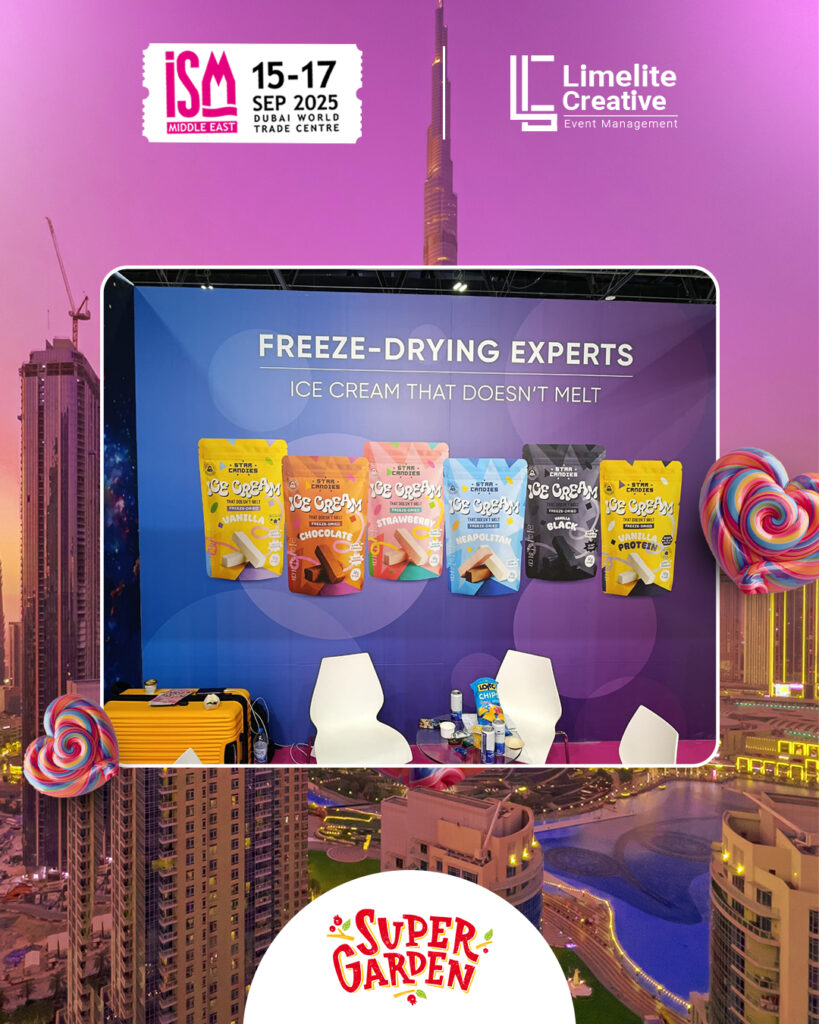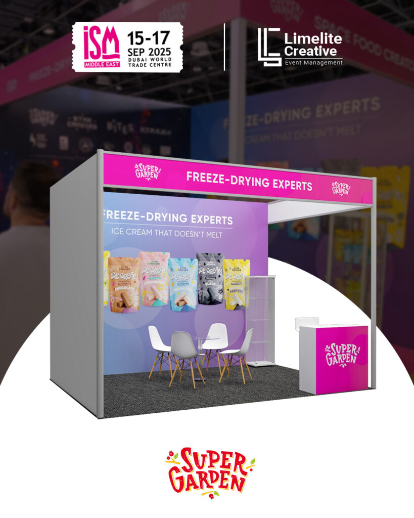 A clean and nature-inspired booth created for Super Garden at ISM 2025, blending modern design with organic elements to reflect the brand’s focus on natural goodness and innovation. The space featured earthy tones, subtle greenery, and interactive product displays, offering visitors an immersive experience that highlighted Super Garden’s commitment to healthy, freeze-dried perfection.
