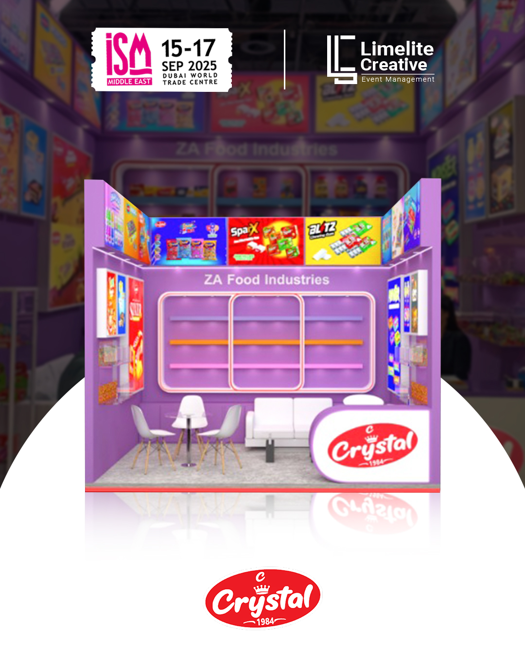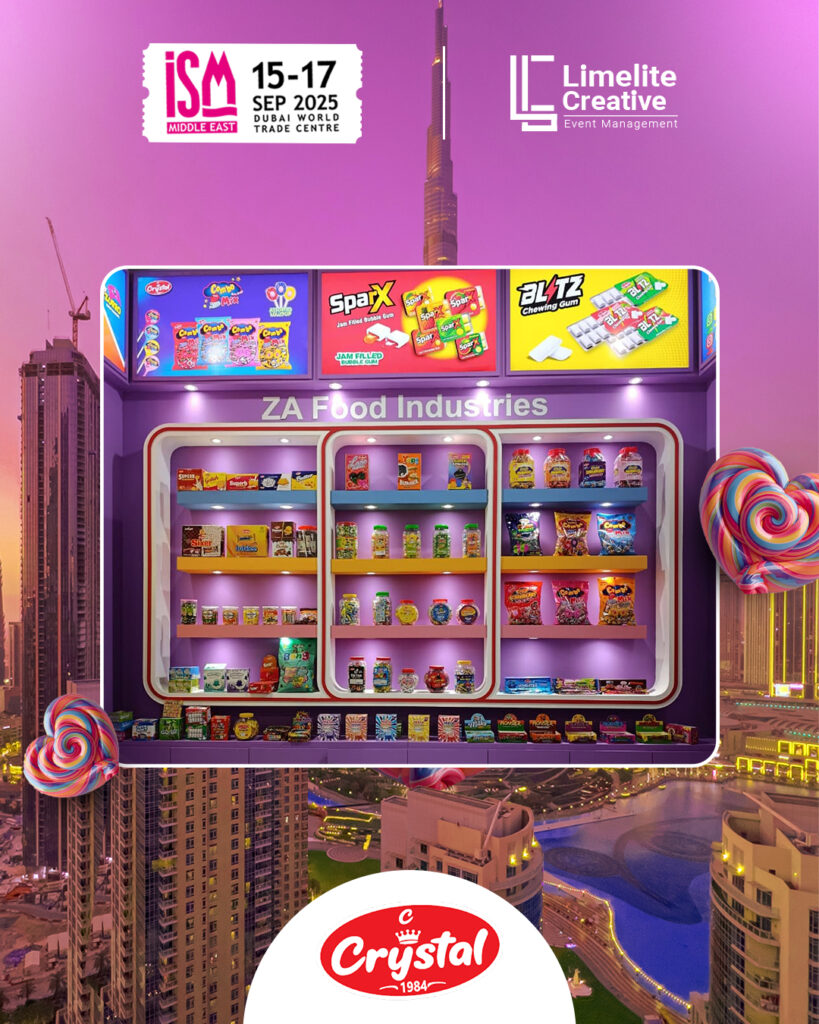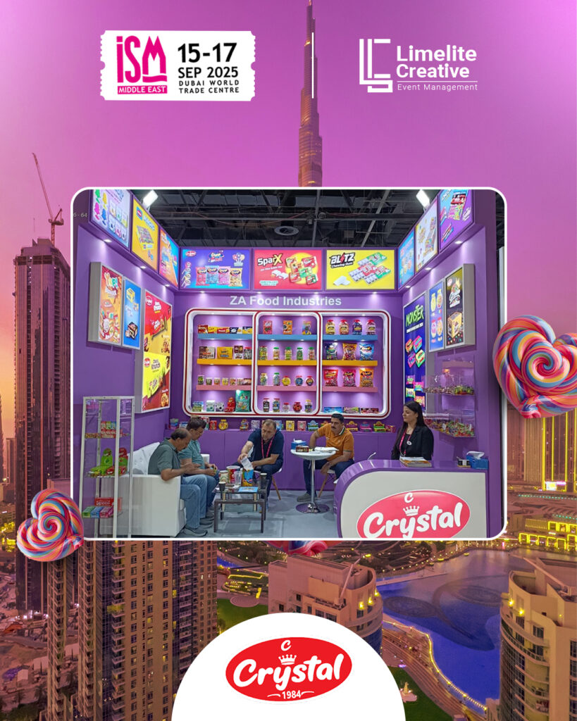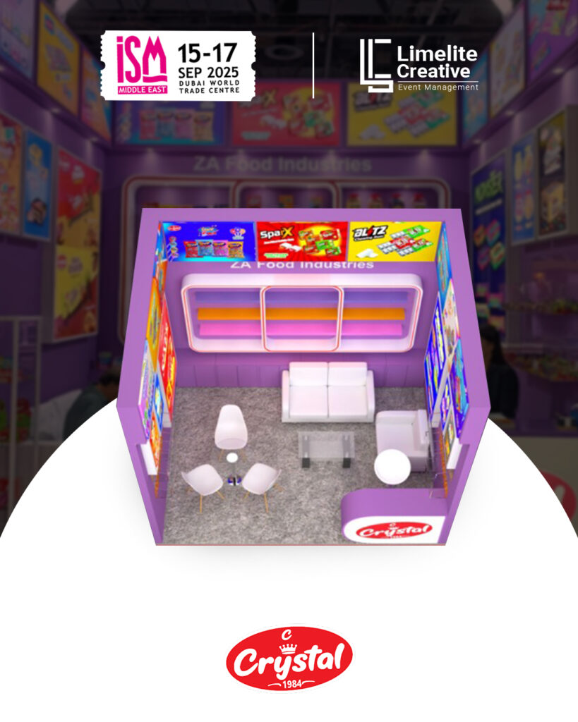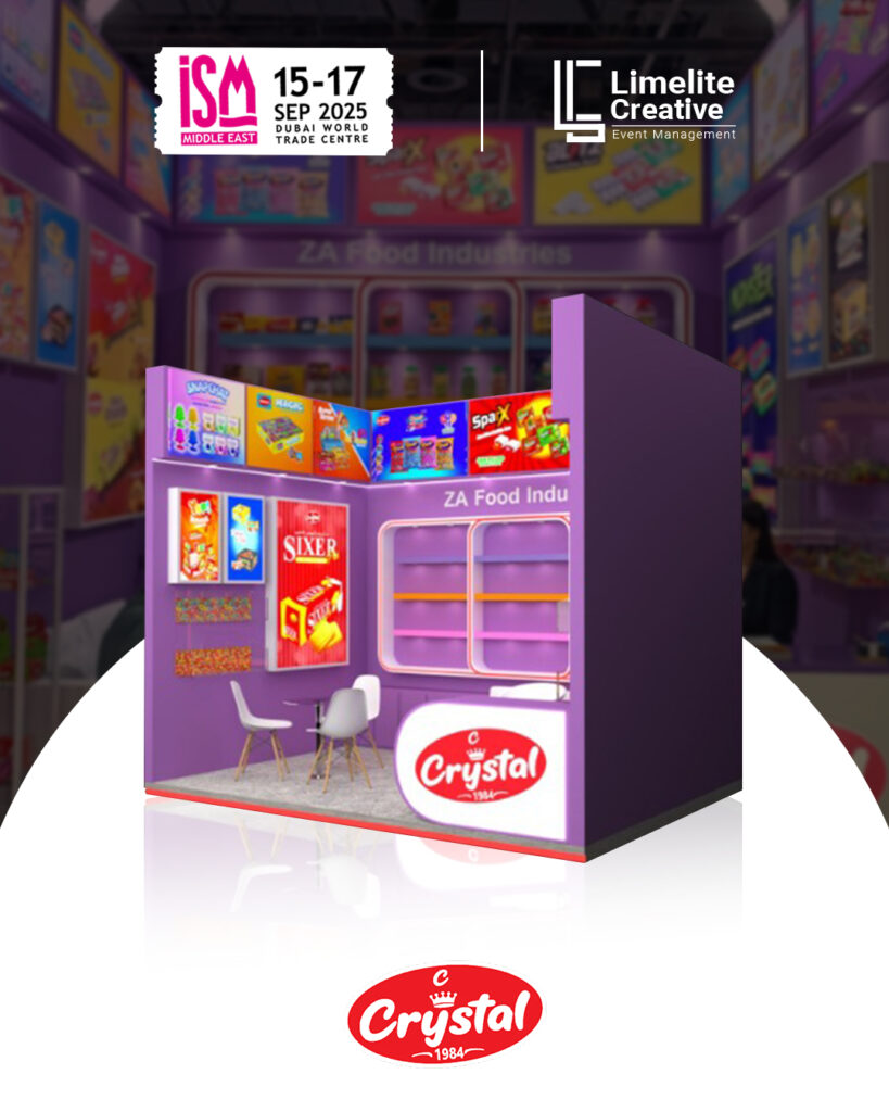 A clean and contemporary booth designed for ZA Food at ISM 2025, combining minimalist aesthetics with vibrant brand storytelling. The space featured modern materials, accent lighting, and interactive display zones that highlighted ZA Food’s commitment to quality, flavor innovation, and a fresh approach to global snacking trends.